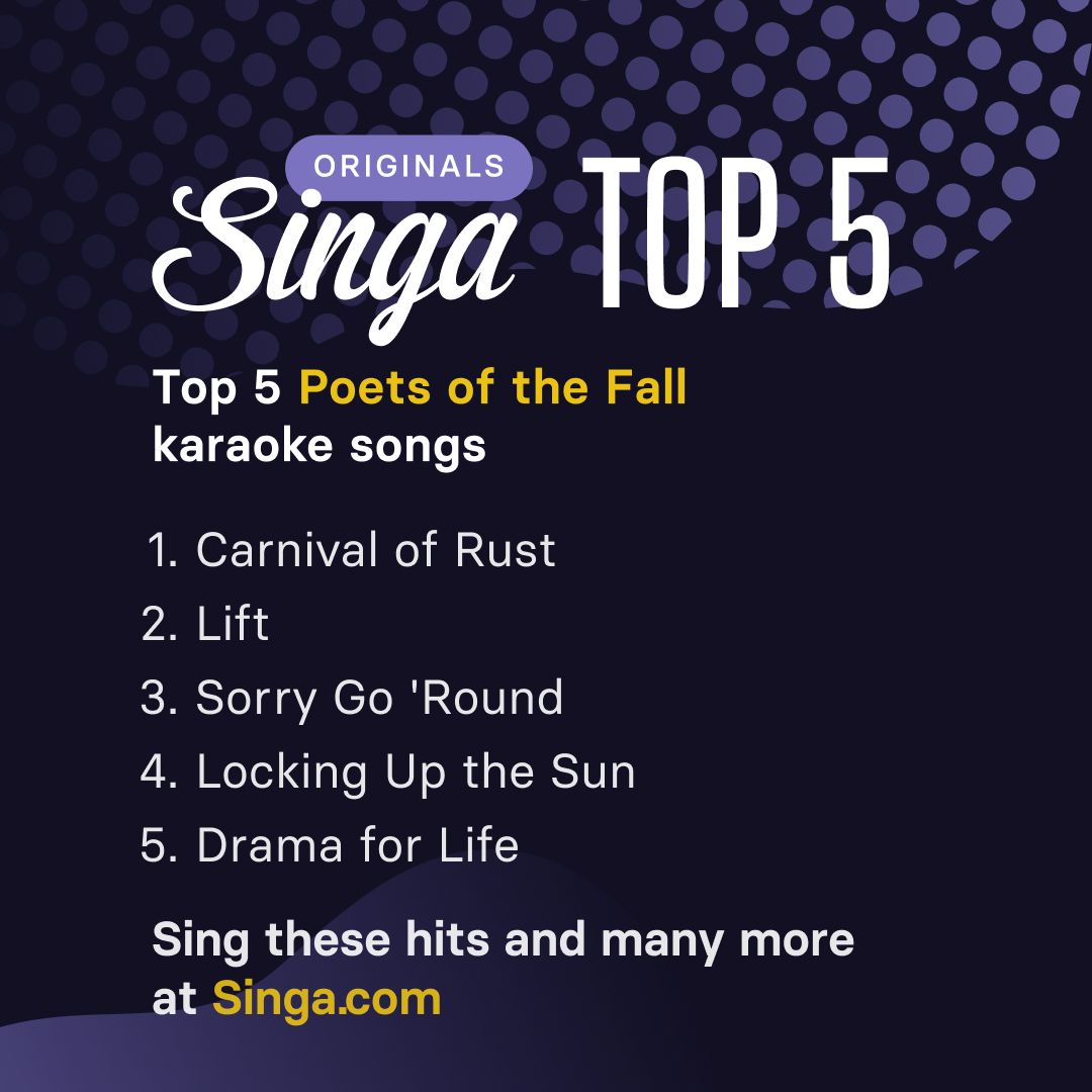 Here are the top 5 Poet's of the Fall songs based on data from karaoke singers using the Singa app. Plus, their original versions are available on Singa as part of our Merlin partnership, bringing the best of independent music to karaoke stages everywhere.