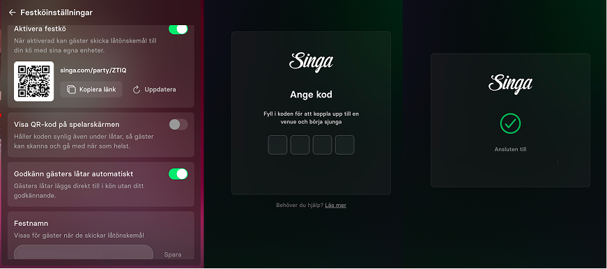 Från där kan dina gäster bläddra i Singas låtkatalog och önska låtar direkt till din kö. Du behöver inte skicka runt olika enheter. Inga avbrott. Bara musiken, människorna och stunden. Det bästa av allt? Dina gäster behöver ingen Singa-prenumeration för att vara med! De skannar QR-koden och kan börja lägga till sina favoritlåtar i festkön!